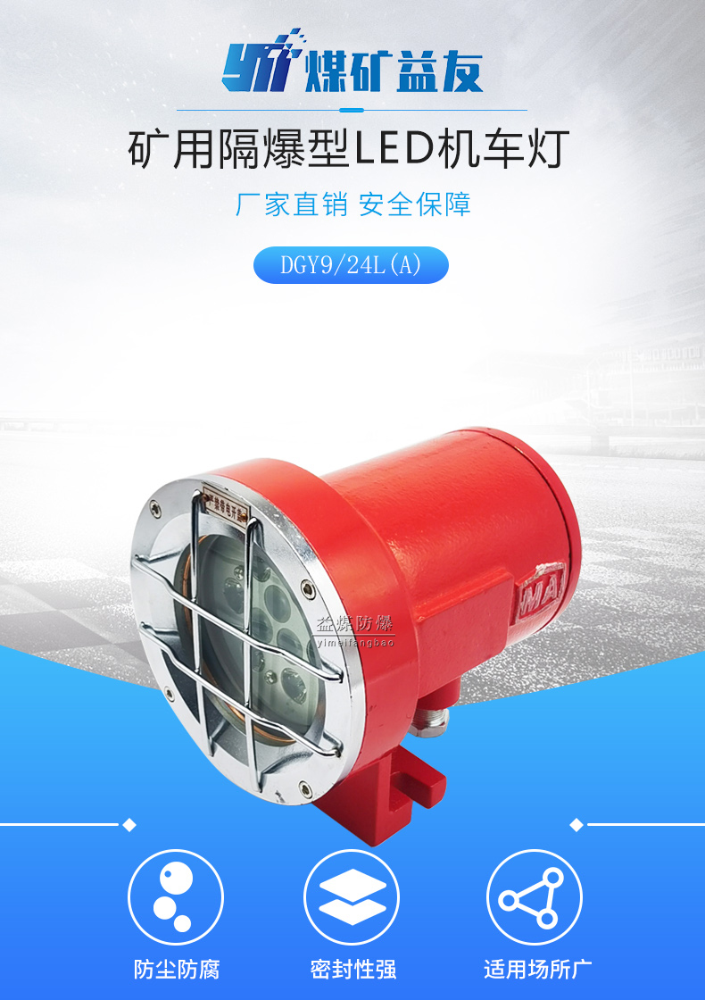LED矿用隔爆型机车灯主要适用于具有甲烷和煤尘爆炸危险的矿井下的蓄电池式电机车、防爆车、掘进机、扒装机、铲煤机上,供机车工作照明使用。